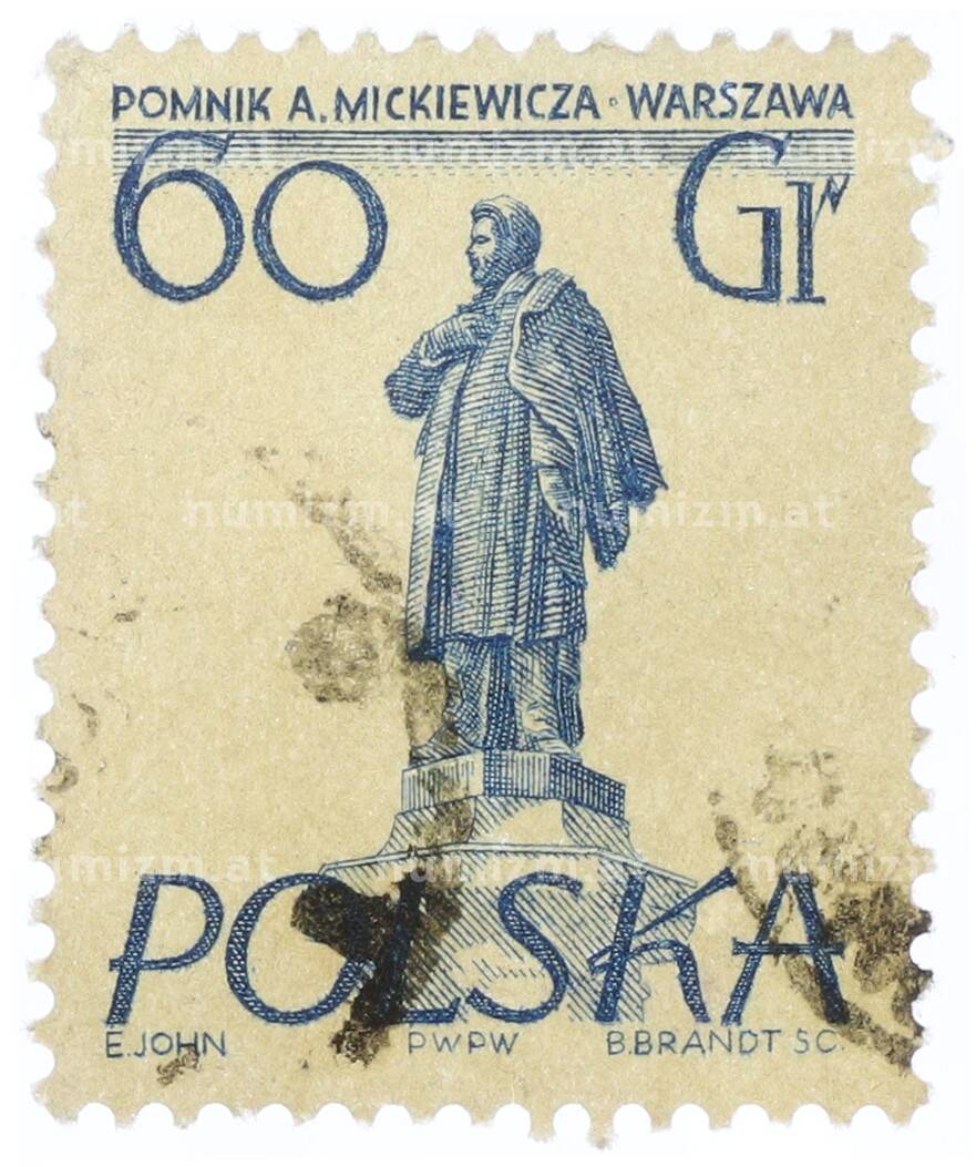 Почтовая марка 60 грошей 1955 года Польша «Памятники Варшавы — Адам Мицкевич» (Артикул: T11-34358): подробные характеристики, качественные фотографии в высоком разрешении, низкая цена.