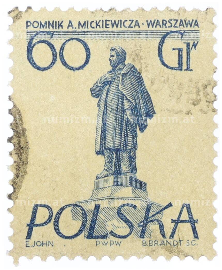 Почтовая марка 60 грошей 1955 года Польша «Памятники Варшавы — Адам Мицкевич» (Артикул: T11-34363): подробные характеристики, качественные фотографии в высоком разрешении, низкая цена.