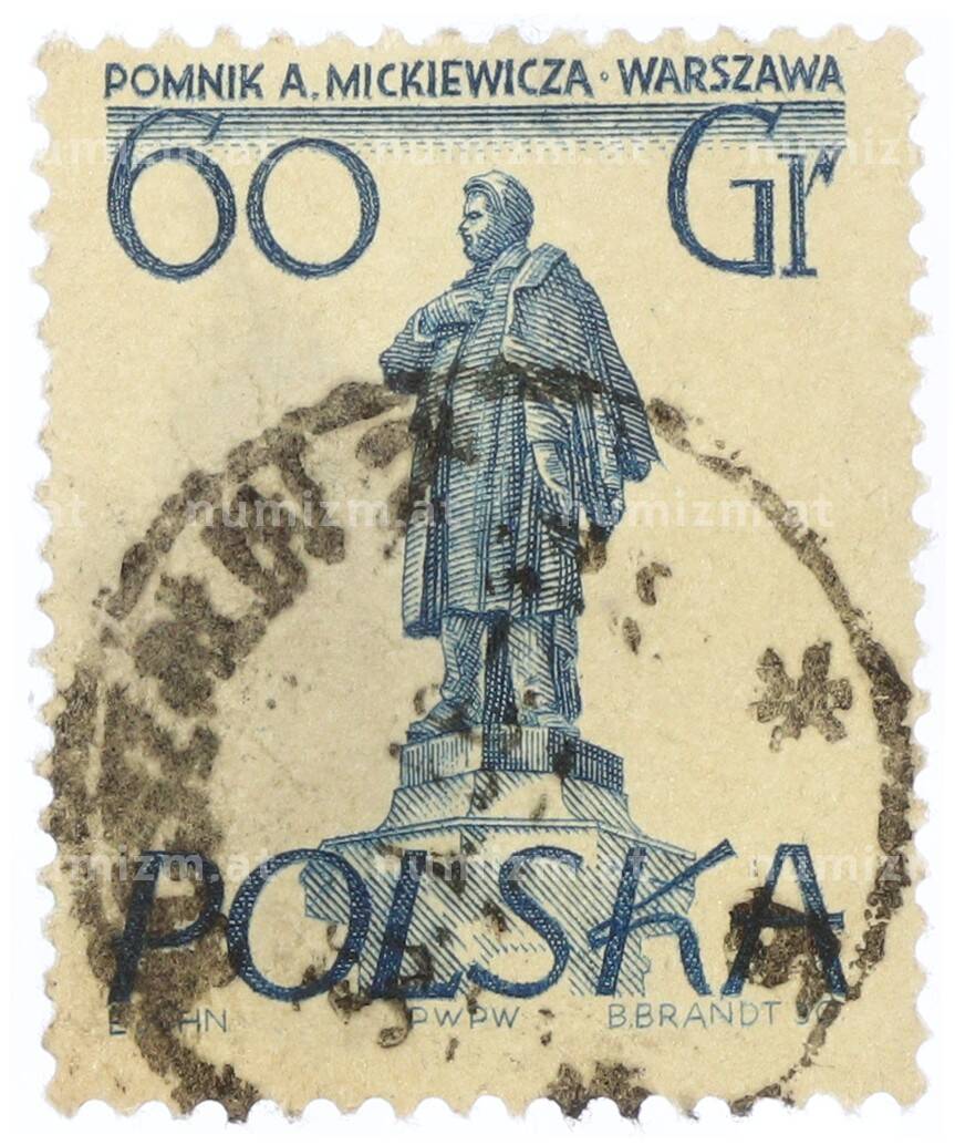 Почтовая марка 60 грошей 1955 года Польша «Памятники Варшавы — Адам Мицкевич» (Артикул: T11-34366): подробные характеристики, качественные фотографии в высоком разрешении, низкая цена.