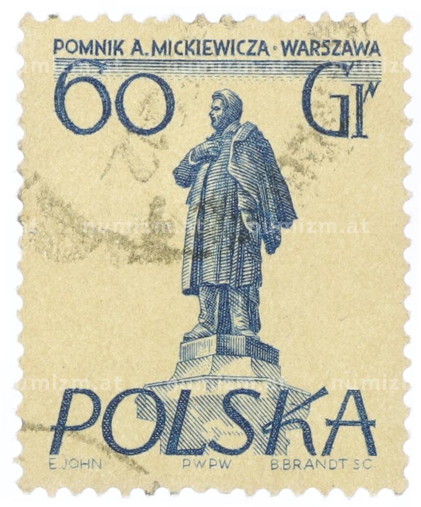 Почтовая марка 60 грошей 1955 года Польша «Памятники Варшавы — Адам Мицкевич» (Артикул: T11-34369): подробные характеристики, качественные фотографии в высоком разрешении, низкая цена.