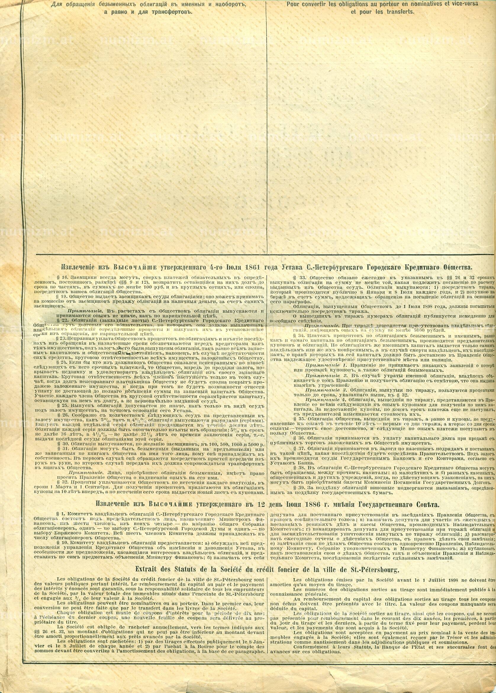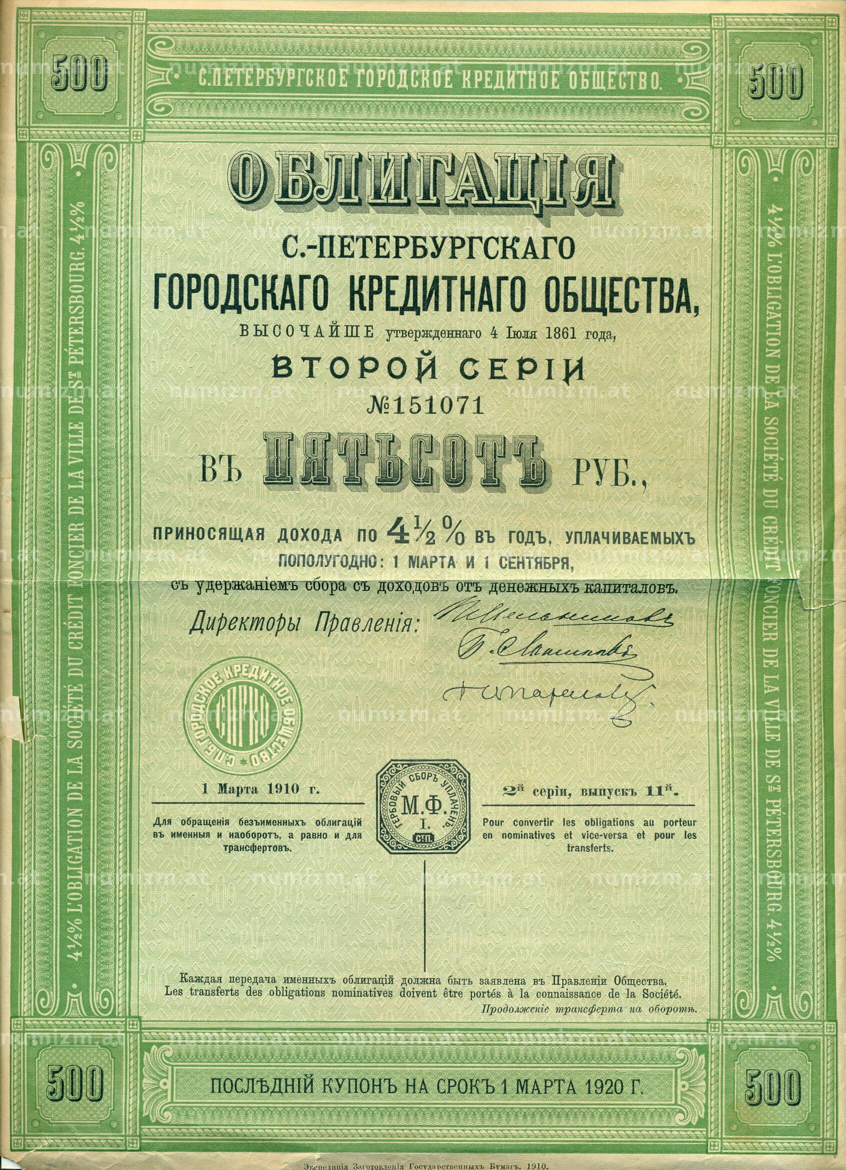 20.01.2025Интернет магазин «Нумизмат» предлагает приобрести Облигация 500 рублей 1910 года «Петербургское городское кредитное общество».