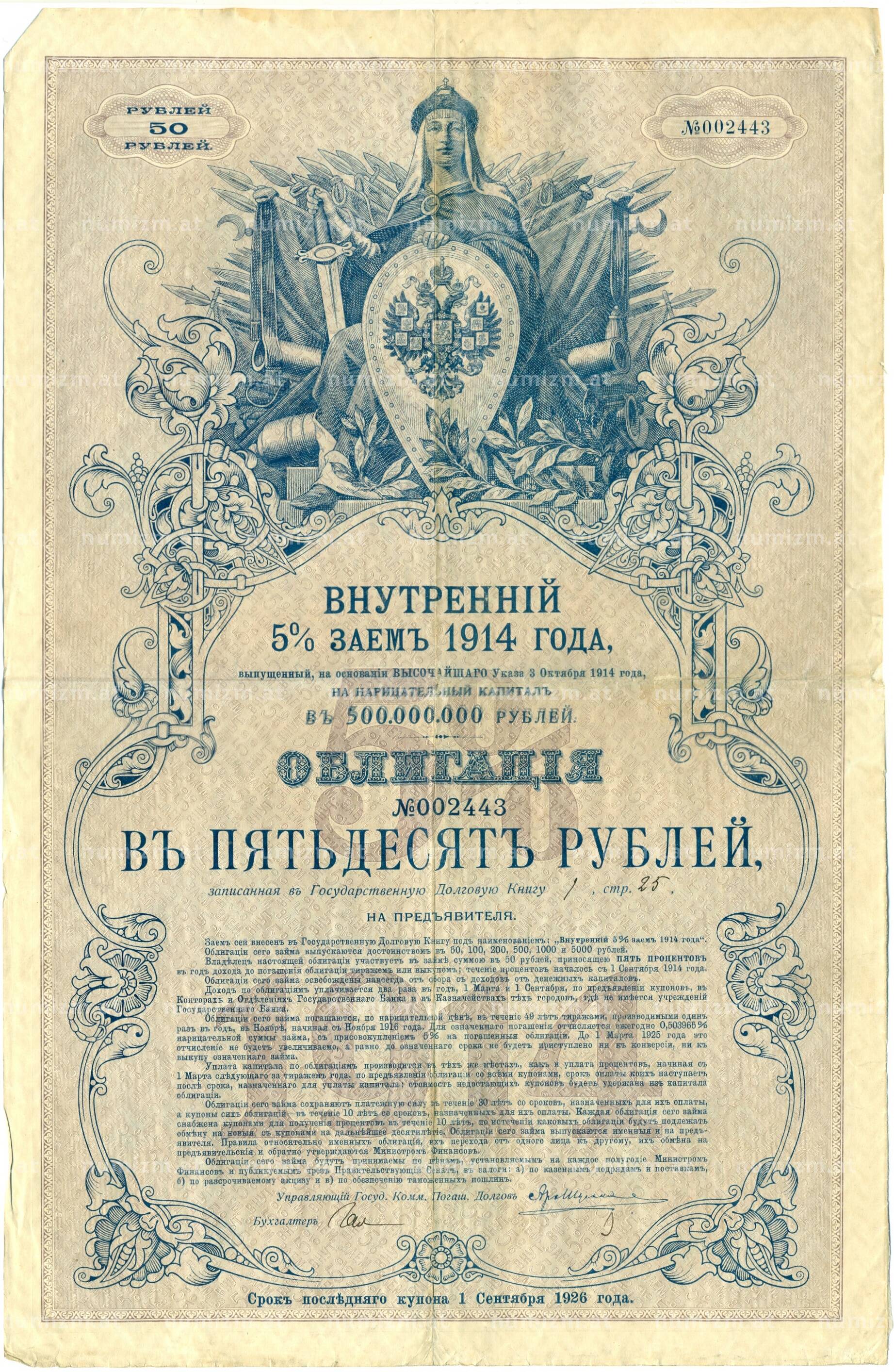 Купить Облигация 50 рублей 1914 года «Внутренний заем» по привлекательной цене можно в нашем интернет-магазине — Вам достаточно оформить заказ на сайте. Все монеты, представленные в каталоге, находятся в наличии на нашем складе.