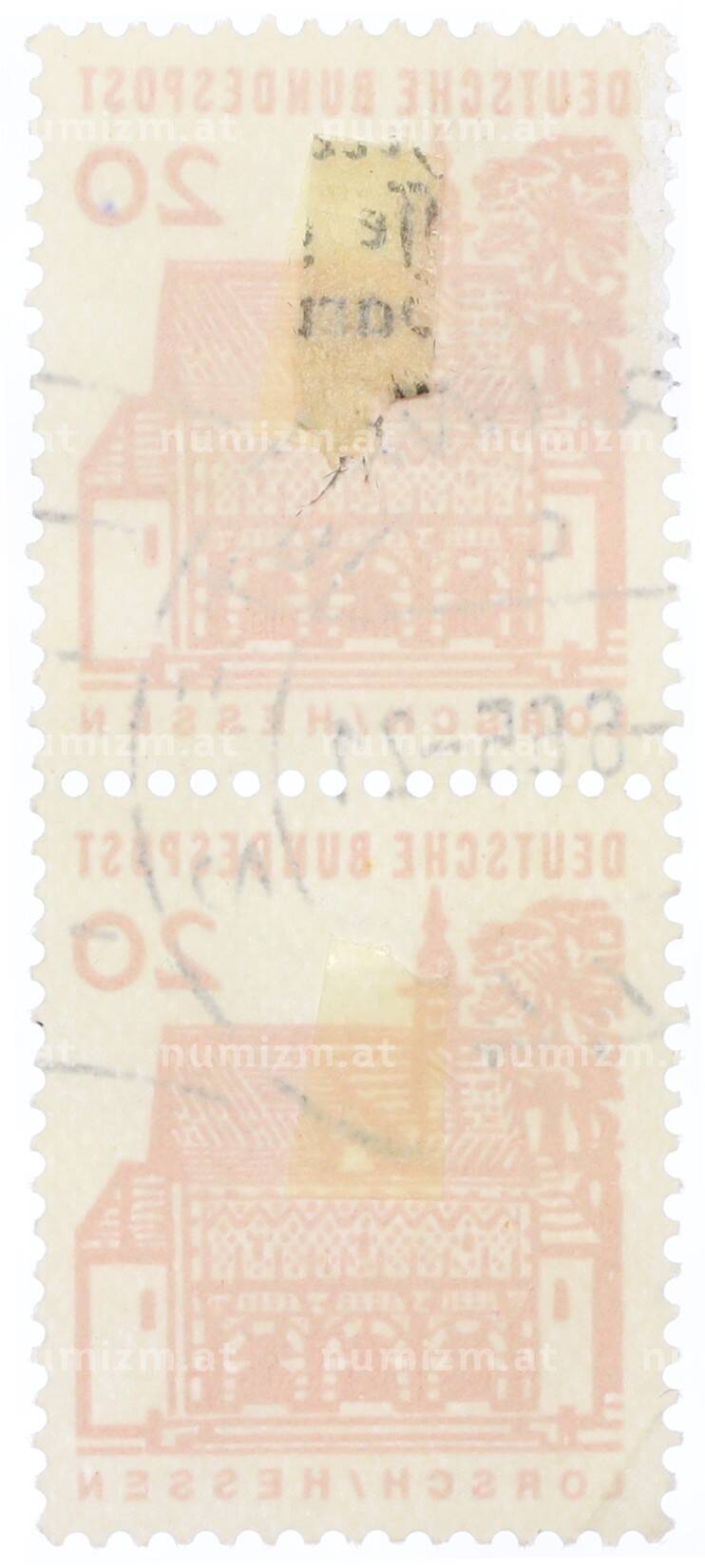 20.01.2025Интернет магазин «Нумизмат» предлагает приобрести Сцепка из 2 марок 20 пфеннигов 1965 года Западная Германия (ФРГ) «Ворота Лоршского монастыря в Гессене».