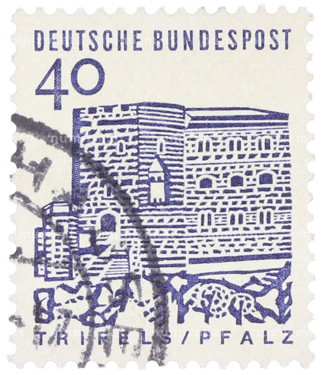 Почтовая марка 40 пфеннигов 1965 года Западная Германия (ФРГ) «Немецкие постройки XII века — Замок Трифельс в Пфальце» (Артикул: T11-35296): подробные характеристики, качественные фотографии в высоком разрешении, низкая цена.