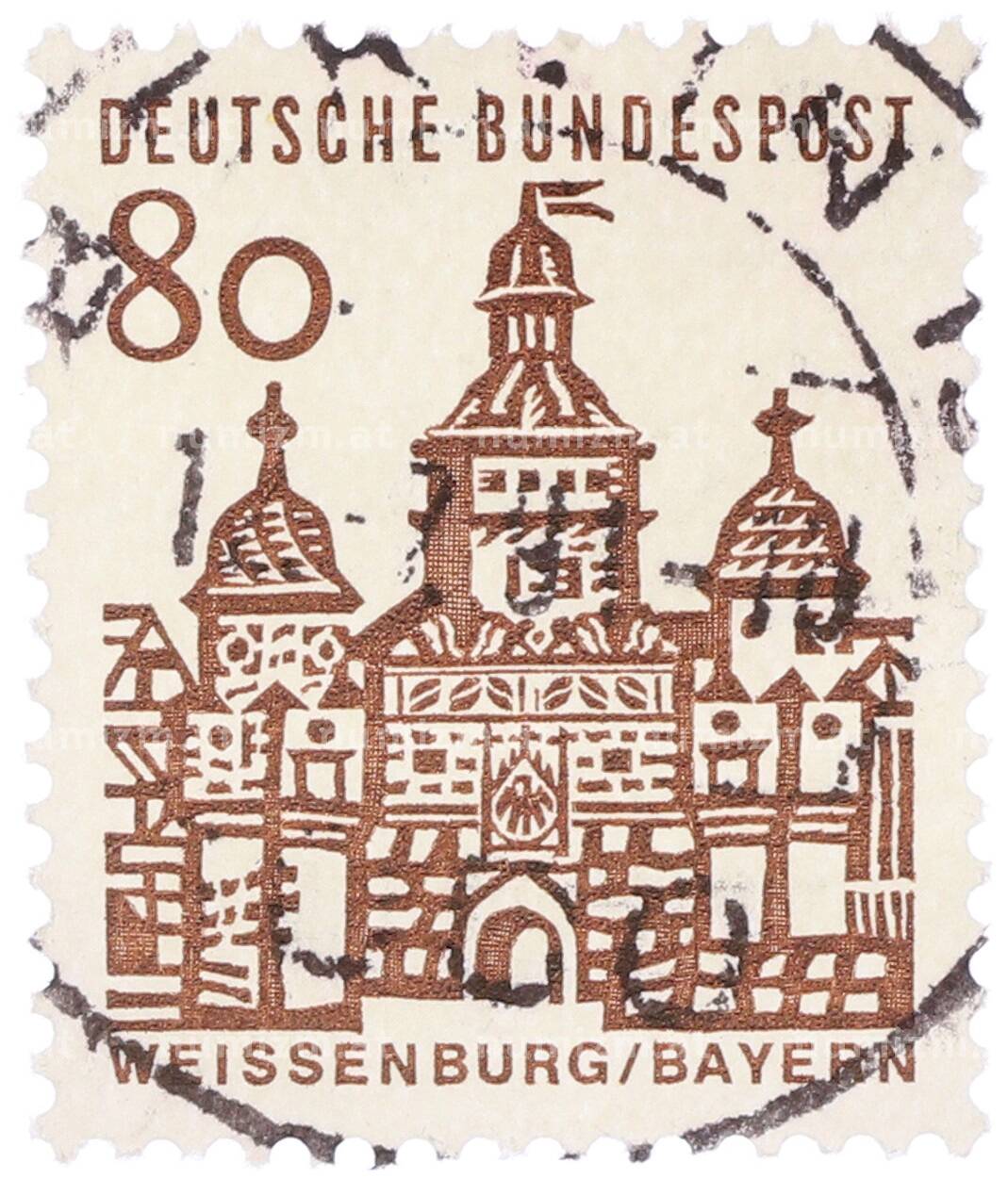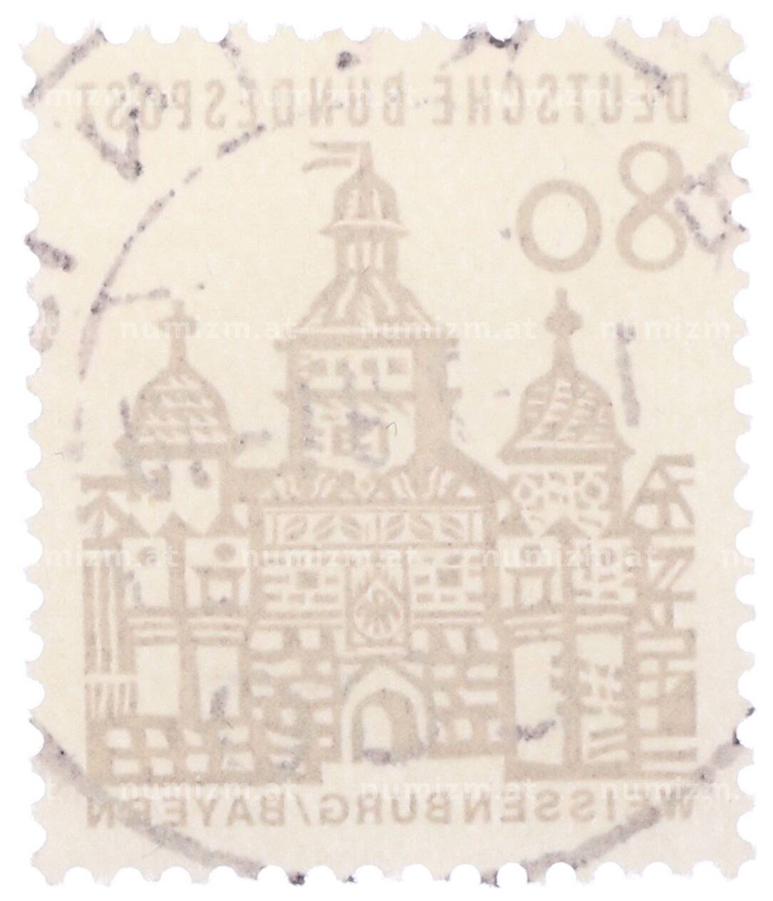 Интернет магазин «Нумизмат» предлагает приобрести Почтовая марка 80 пфеннигов 1965 года Западная Германия (ФРГ) «Немецкие постройки XII века — Ворота Эллингера в Вайсенбурге».