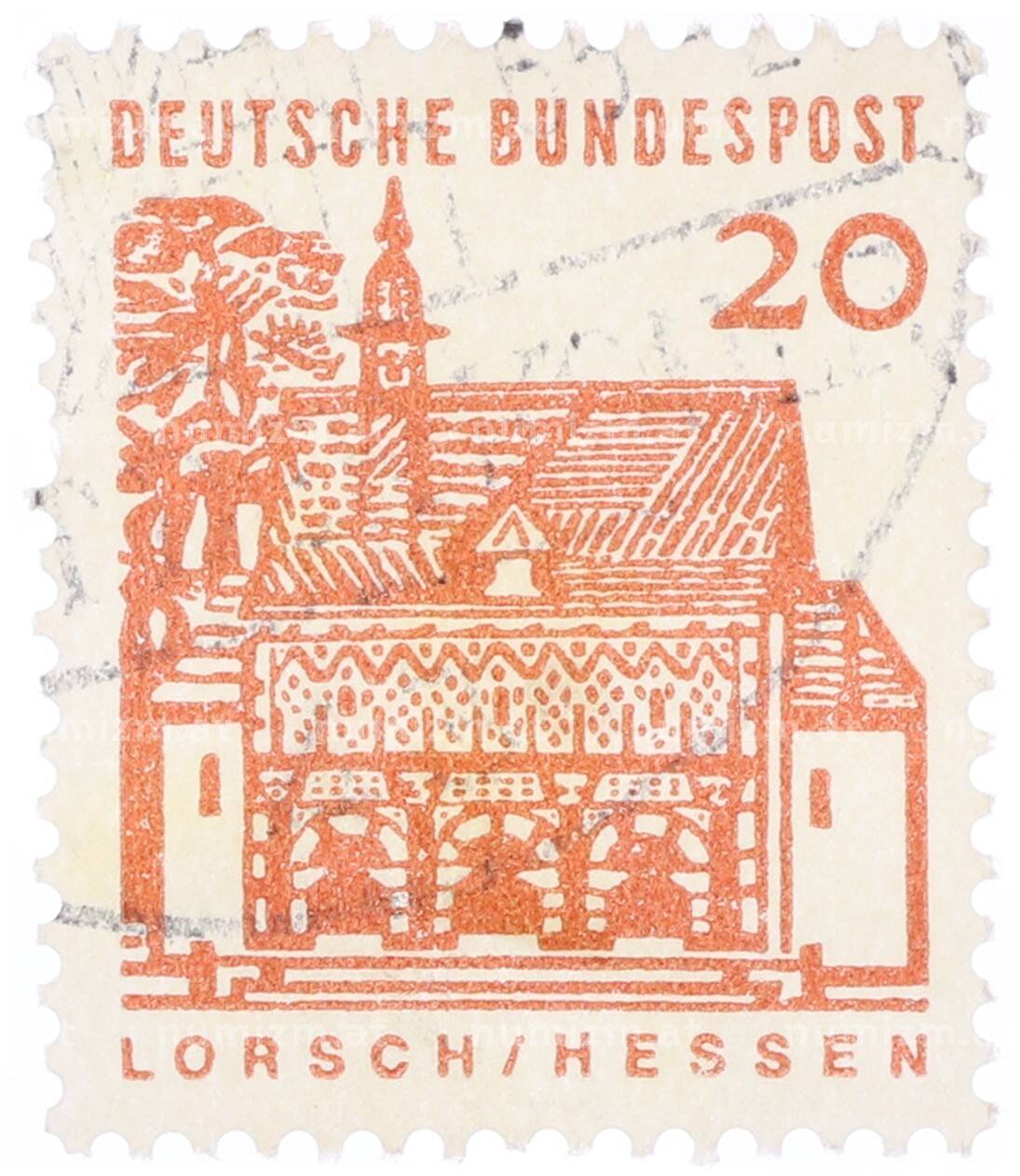 Почтовая марка 20 пфеннигов 1965 года Западная Германия (ФРГ) «Немецкие постройки XII века — Ворота Лоршского монастыря в Гессене» (Артикул: T11-35320): подробные характеристики, качественные фотографии в высоком разрешении, низкая цена.