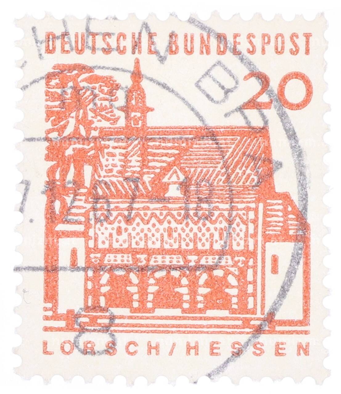 Почтовая марка 20 пфеннигов 1965 года Западная Германия (ФРГ) «Немецкие постройки XII века — Ворота Лоршского монастыря в Гессене» [Артикул: T11-35321]