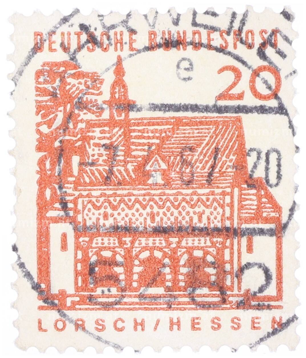 Почтовая марка 20 пфеннигов 1965 года Западная Германия (ФРГ) «Немецкие постройки XII века — Ворота Лоршского монастыря в Гессене» (Артикул: T11-35324): подробные характеристики, качественные фотографии в высоком разрешении, низкая цена.
