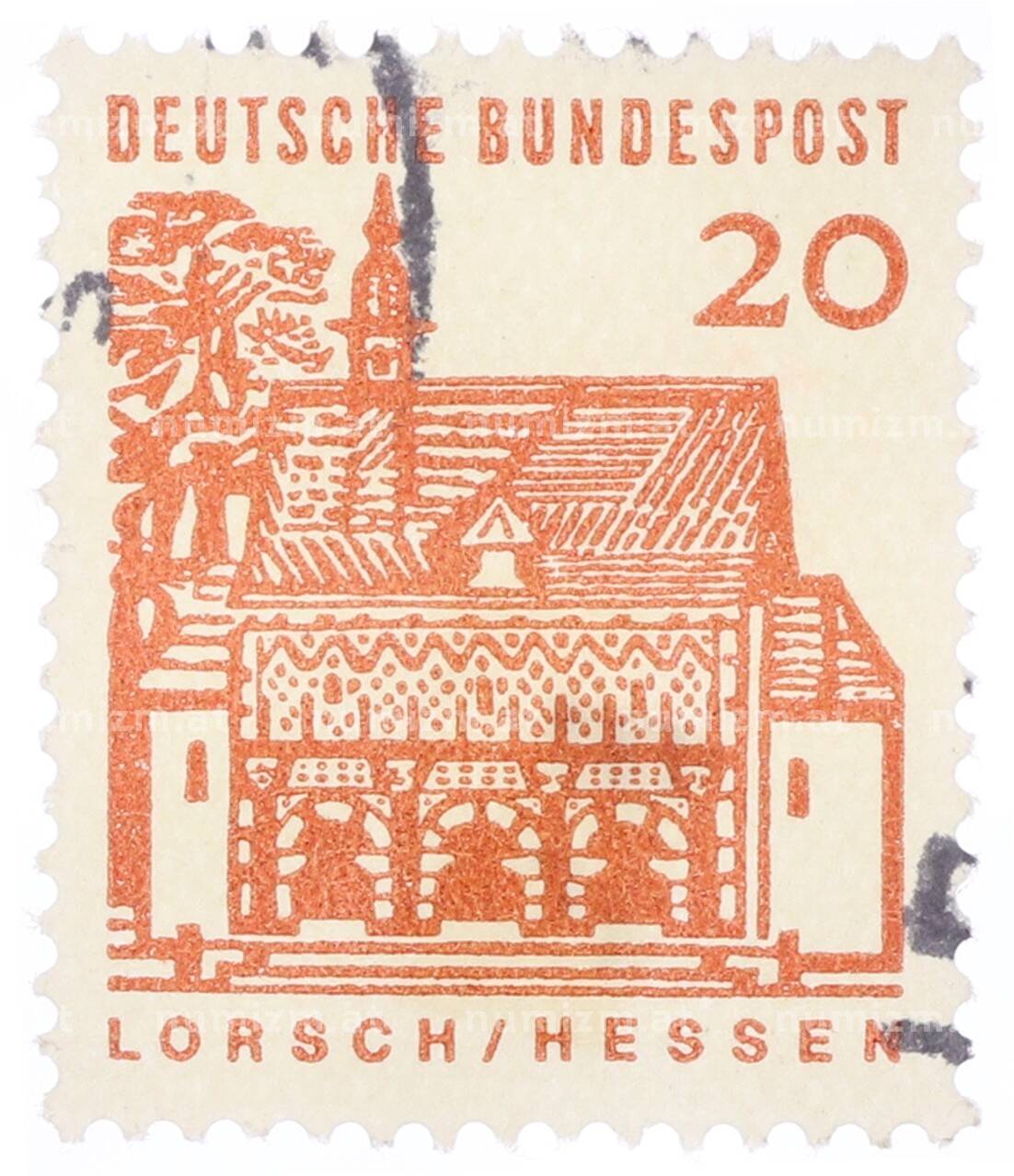 Интернет магазин «Нумизмат» предлагает приобрести Почтовая марка 20 пфеннигов 1965 года Западная Германия (ФРГ) «Немецкие постройки XII века — Ворота Лоршского монастыря в Гессене».