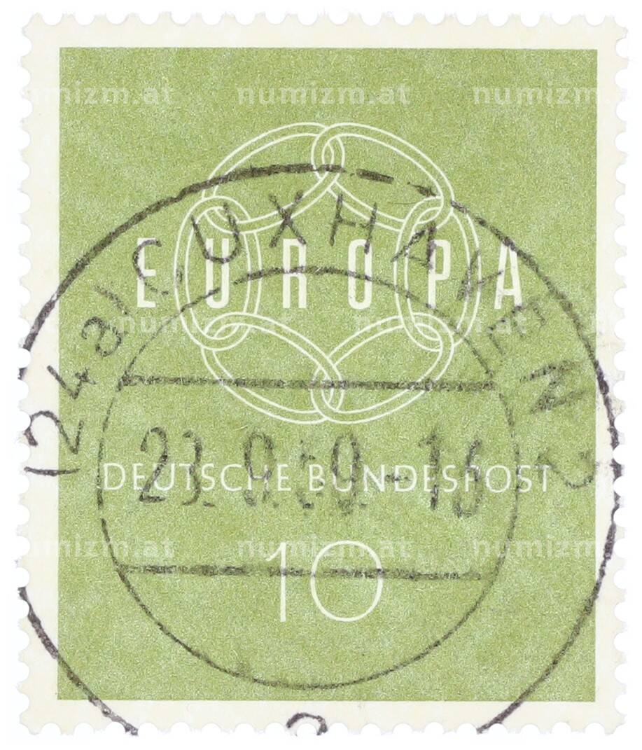 20.01.2025Интернет магазин «Нумизмат» предлагает приобрести Почтовая марка 10 пфеннигов 1959 года Западная Германия (ФРГ) «Европейская конференция администраций почтовых служб и служб связи CEPT — Цепь».
