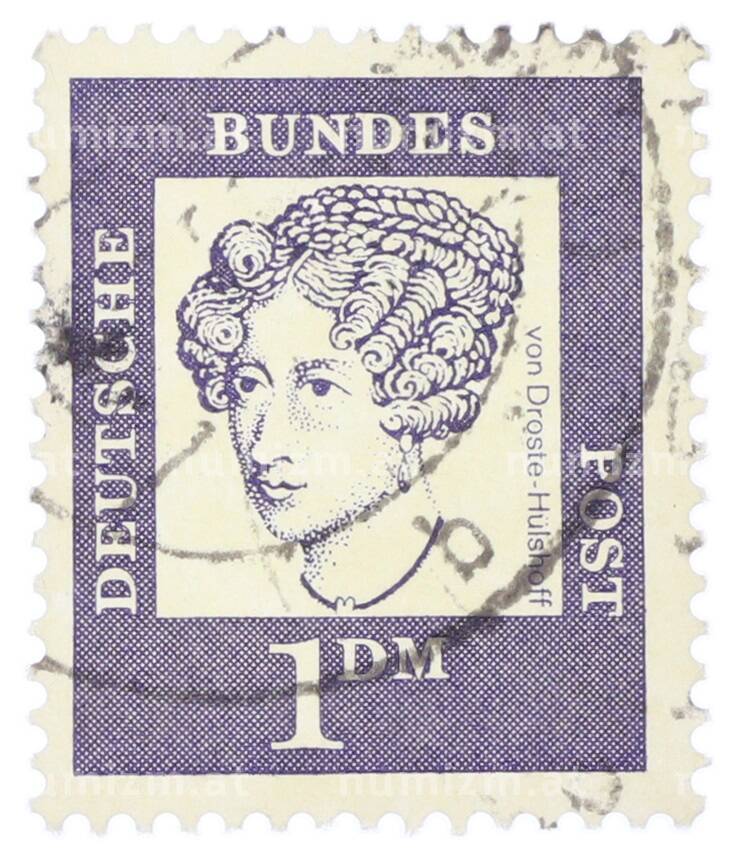Почтовая марка 1 марка 1961 года Западная Германия (ФРГ) «Выдающиеся немцы — Аннетте фон Дросте-Хюльсхофф» (Артикул: T11-35475): подробные характеристики, качественные фотографии в высоком разрешении, низкая цена.