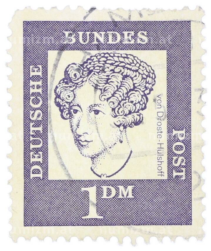Почтовая марка 1 марка 1961 года Западная Германия (ФРГ) «Выдающиеся немцы — Аннетте фон Дросте-Хюльсхофф» (Артикул: T11-35479): подробные характеристики, качественные фотографии в высоком разрешении, низкая цена.