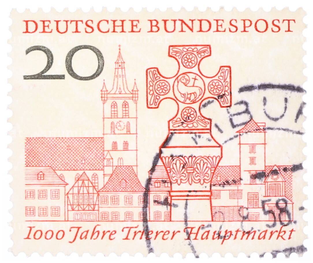 Почтовая марка 20 пфеннигов 1958 года Западная Германия (ФРГ) «Тысячелетие главному рынку Трира» (Артикул: T11-35723): подробные характеристики, качественные фотографии в высоком разрешении, низкая цена.