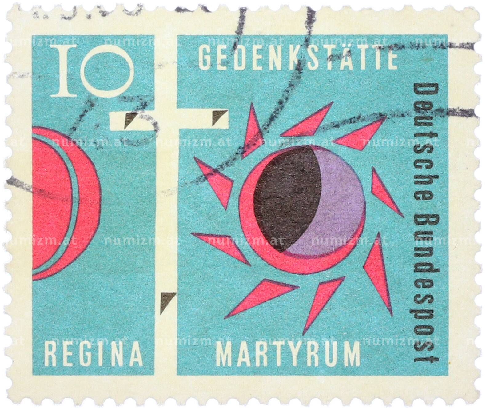 20.01.2025Интернет магазин «Нумизмат» предлагает приобрести Почтовая марка 10 пфеннигов 1963 года Западная Германия (ФРГ) «Мученица Регина».
