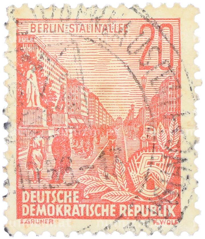 Почтовая марка 20 пфеннигов 1955 года Восточная Германия (ГДР) «Пятилетний план — Проспект Сталина» (Артикул: T11-36215): подробные характеристики, качественные фотографии в высоком разрешении, низкая цена.
