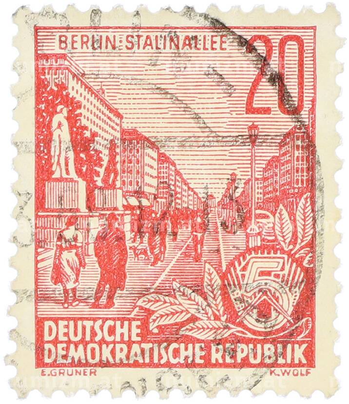 Почтовая марка 20 пфеннигов 1955 года Восточная Германия (ГДР) «Пятилетний план — Проспект Сталина» (Артикул: T11-36230): подробные характеристики, качественные фотографии в высоком разрешении, низкая цена.