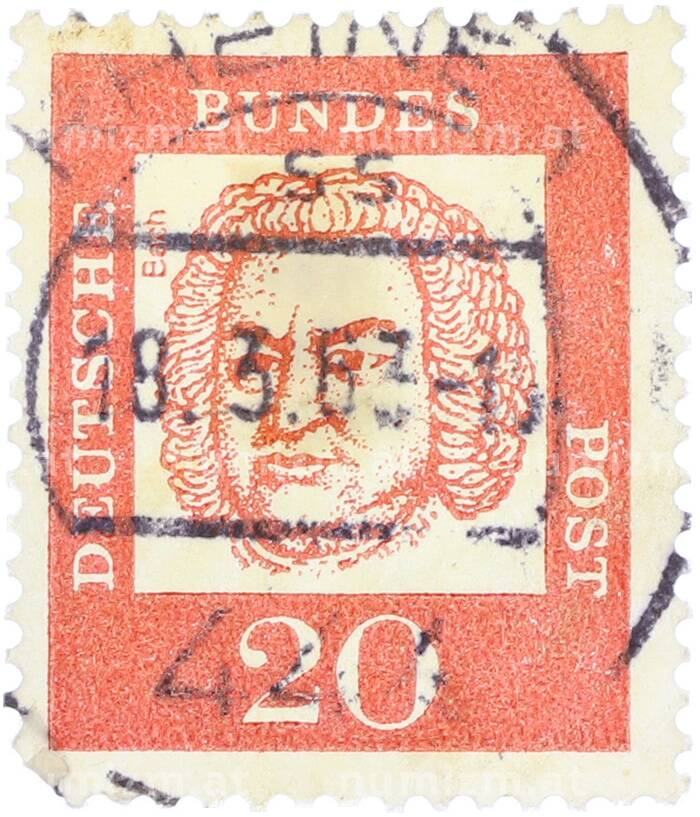 Почтовая марка 20 пфеннигов 1961 года Западная Германия (ФРГ) «Выдающиеся немцы — Иоганн Себастьян Бах» (Артикул: T11-36280): подробные характеристики, качественные фотографии в высоком разрешении, низкая цена.