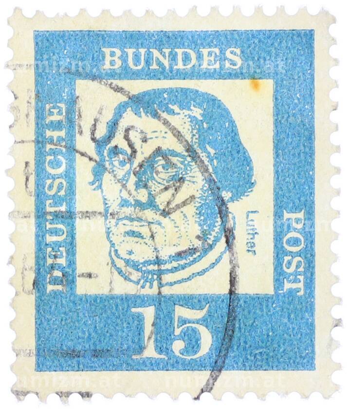 Интернет магазин «Нумизмат» предлагает приобрести Почтовая марка 15 пфеннигов 1961 года Западная Германия (ФРГ) «Выдающиеся немцы — Мартин Лютер».