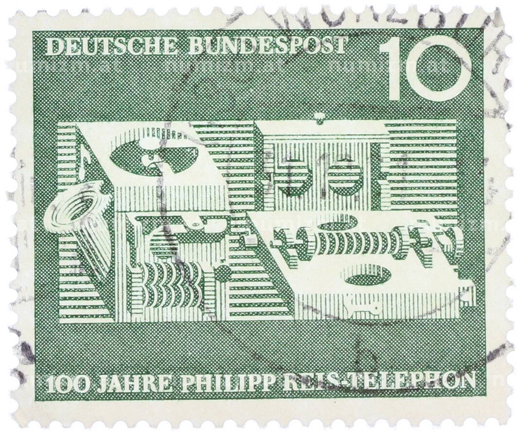 Почтовая марка 10 пфеннигов 1961 года Западная Германия (ФРГ) «100-летие изобретения телефона Филиппом Рейсом» (Артикул: T11-36898): подробные характеристики, качественные фотографии в высоком разрешении, низкая цена.
