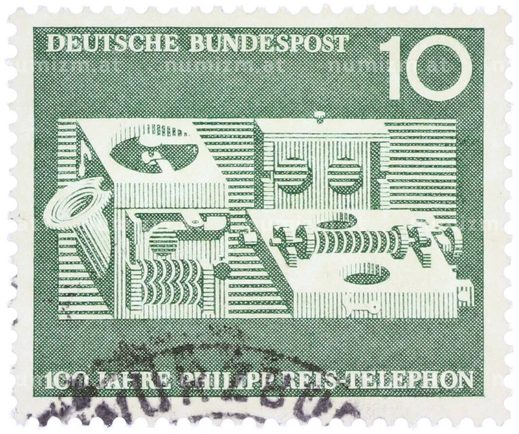 Почтовая марка 10 пфеннигов 1961 года Западная Германия (ФРГ) «100-летие изобретения телефона Филиппом Рейсом» (Артикул: T11-36899): подробные характеристики, качественные фотографии в высоком разрешении, низкая цена.
