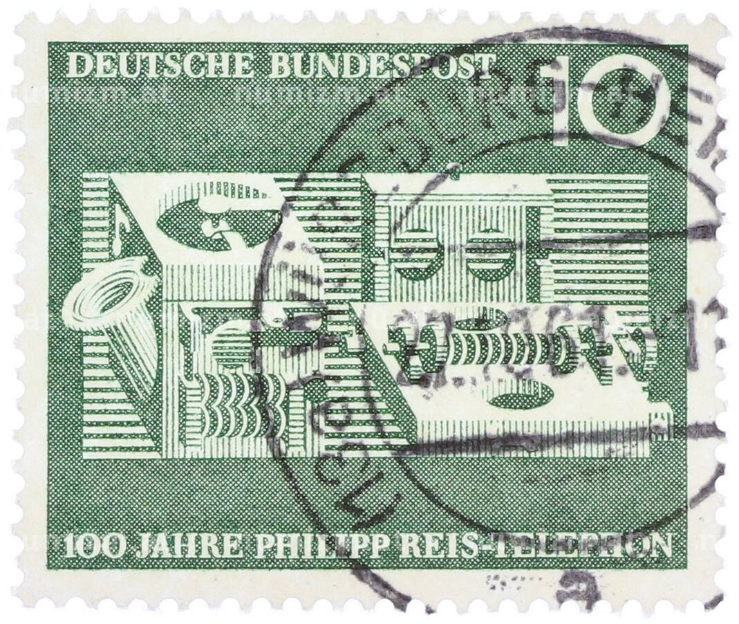 Почтовая марка 10 пфеннигов 1961 года Западная Германия (ФРГ) «100-летие изобретения телефона Филиппом Рейсом» (Артикул: T11-36900): подробные характеристики, качественные фотографии в высоком разрешении, низкая цена.