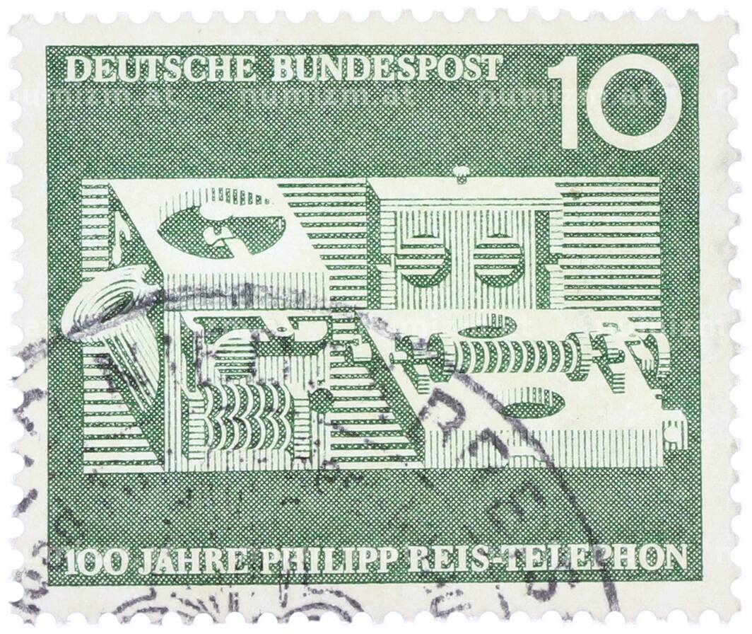 Почтовая марка 10 пфеннигов 1961 года Западная Германия (ФРГ) «100-летие изобретения телефона Филиппом Рейсом» (Артикул: T11-36901): подробные характеристики, качественные фотографии в высоком разрешении, низкая цена.
