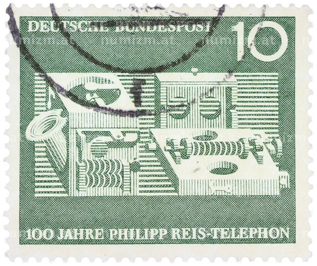 Почтовая марка 10 пфеннигов 1961 года Западная Германия (ФРГ) «100-летие изобретения телефона Филиппом Рейсом» (Артикул: T11-36904): подробные характеристики, качественные фотографии в высоком разрешении, низкая цена.