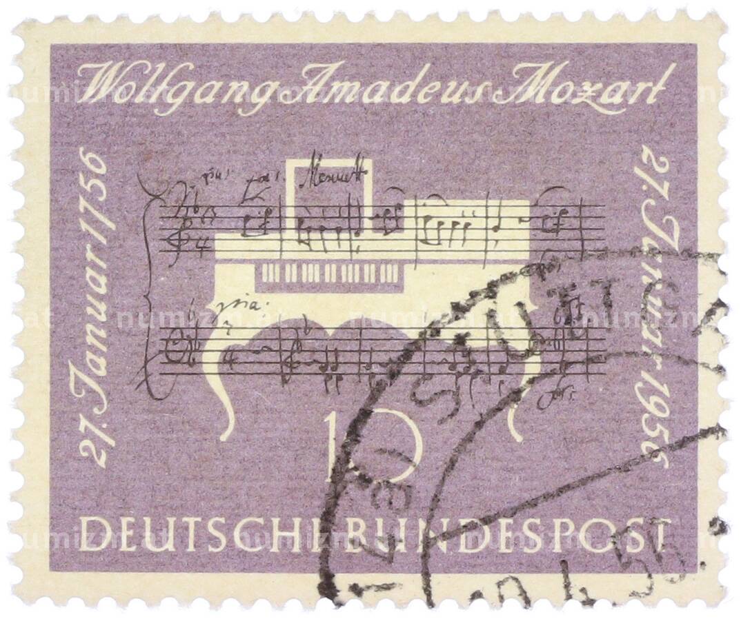Купить Почтовая марка 10 пфеннигов 1956 года Западная Германия (ФРГ) «200-летие со дня рождения Вольфганга Амадея Моцарта» по привлекательной цене можно в нашем интернет-магазине — Вам достаточно оформить заказ на сайте. Все монеты, представленные в каталоге, находятся в наличии на нашем складе.