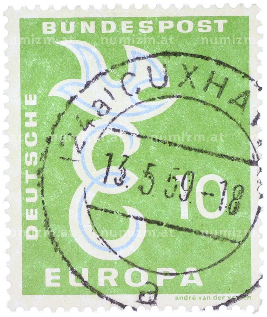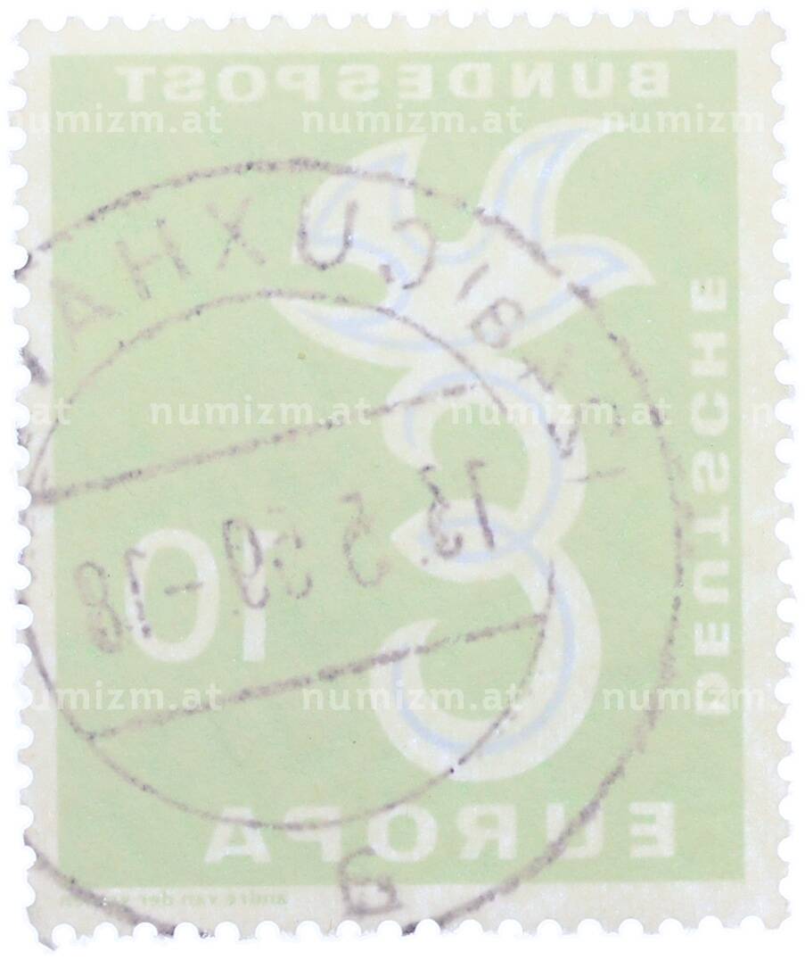 Интернет магазин «Нумизмат» предлагает приобрести Почтовая марка 10 пфеннигов 1958 года Западная Германия (ФРГ) «Европейская конференция администраций почтовых служб и служб связи CEPT — Голубь мира».