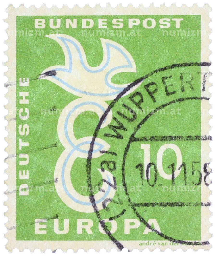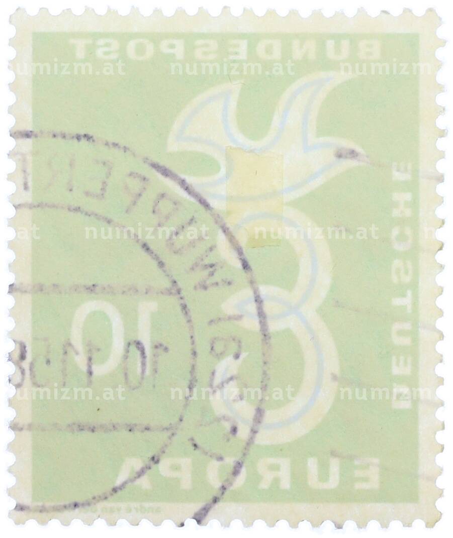 20.01.2025Интернет магазин «Нумизмат» предлагает приобрести Почтовая марка 10 пфеннигов 1958 года Западная Германия (ФРГ) «Европейская конференция администраций почтовых служб и служб связи CEPT — Голубь мира».