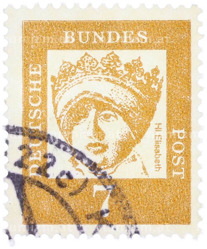 Почтовая марка 7 пфеннигов 1961 года Западная Германия (ФРГ) «Выдающиеся немцы — Елизавета Венгерская» (Артикул: T11-37000): подробные характеристики, качественные фотографии в высоком разрешении, низкая цена.