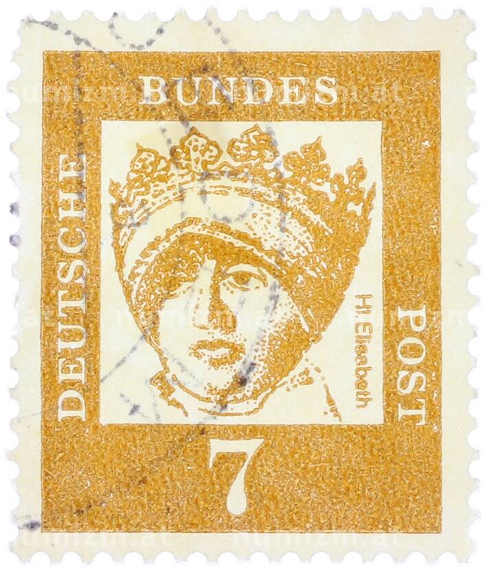 Купить Почтовая марка 7 пфеннигов 1961 года Западная Германия (ФРГ) «Выдающиеся немцы — Елизавета Венгерская» по привлекательной цене можно в нашем интернет-магазине — Вам достаточно оформить заказ на сайте. Все монеты, представленные в каталоге, находятся в наличии на нашем складе.