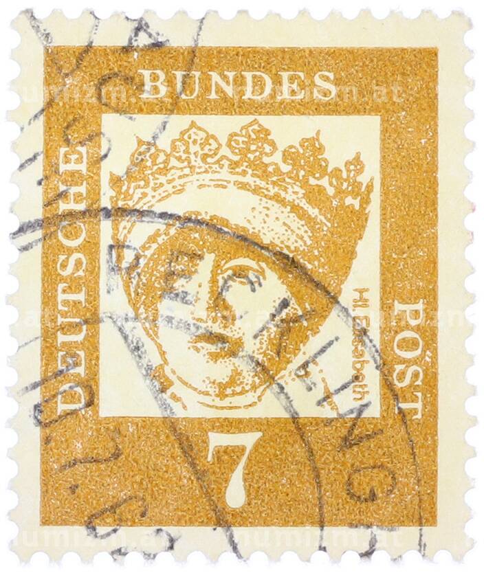 Купить Почтовая марка 7 пфеннигов 1961 года Западная Германия (ФРГ) «Выдающиеся немцы — Елизавета Венгерская» по привлекательной цене можно в нашем интернет-магазине — Вам достаточно оформить заказ на сайте. Все монеты, представленные в каталоге, находятся в наличии на нашем складе.