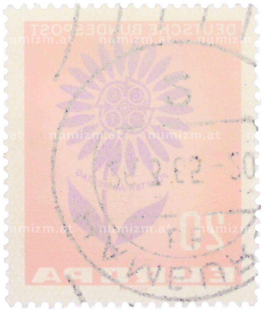 20.01.2025Интернет магазин «Нумизмат» предлагает приобрести Почтовая марка 20 пфеннигов 1964 года Западная Германия (ФРГ) «Европейская конференция администраций почтовых служб и служб связи CEPT — Цветок».