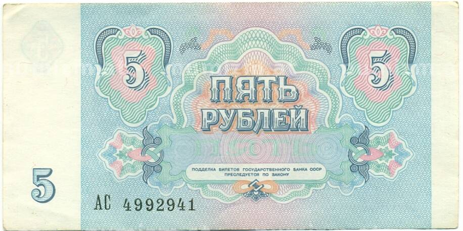 Банкнота 5 рублей 1991 года (Артикул: T11-39291): подробные характеристики, качественные фотографии в высоком разрешении, низкая цена.