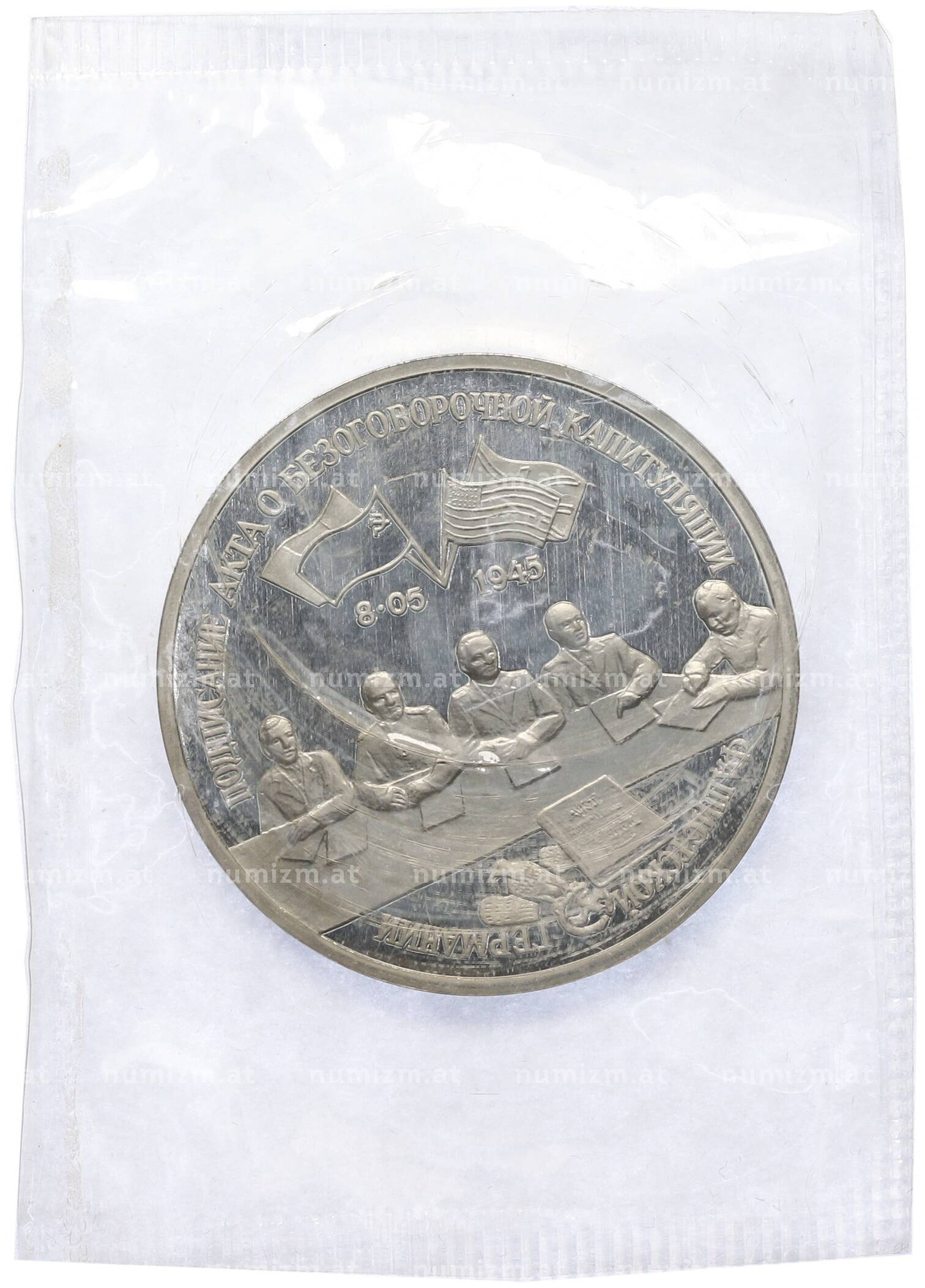 Купить 3 рубля 1995 года ЛМД «Подписание Акта о безоговорочной капитуляции фашистской Германии» по привлекательной цене можно в нашем интернет-магазине — Вам достаточно оформить заказ на сайте. Все монеты, представленные в каталоге, находятся в наличии на нашем складе.