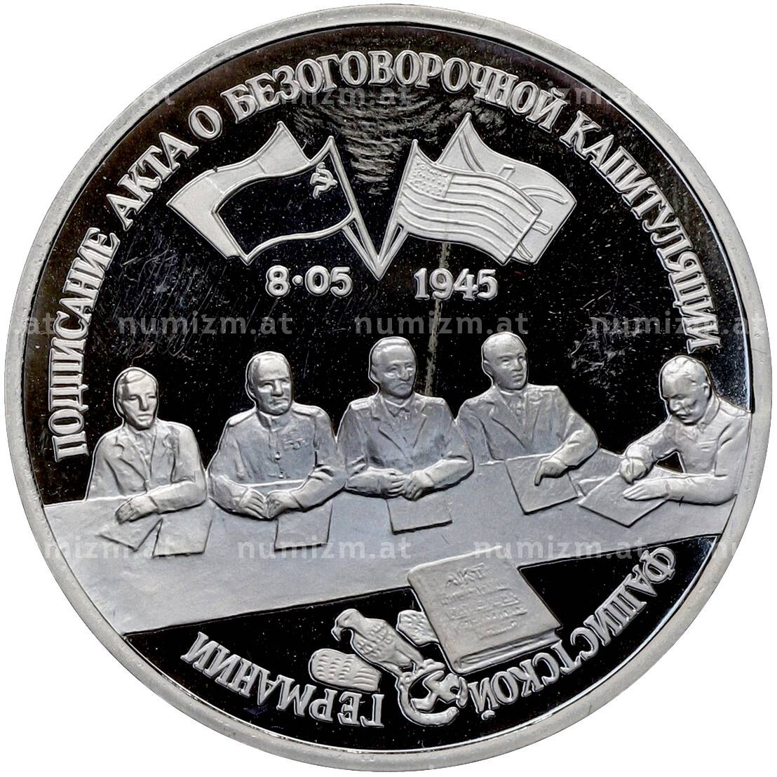 20.01.2025Интернет магазин «Нумизмат» предлагает приобрести 3 рубля 1995 года ЛМД «Подписание Акта о безоговорочной капитуляции фашистской Германии» (Proof).