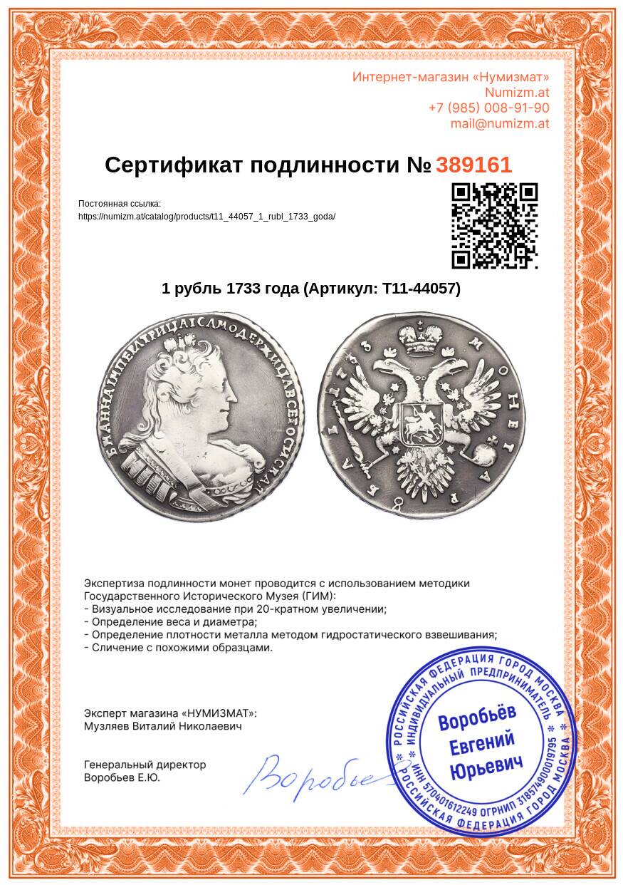 Купить 1 рубль 1733 года по привлекательной цене можно в нашем интернет-магазине — Вам достаточно оформить заказ на сайте. Все монеты, представленные в каталоге, находятся в наличии на нашем складе.