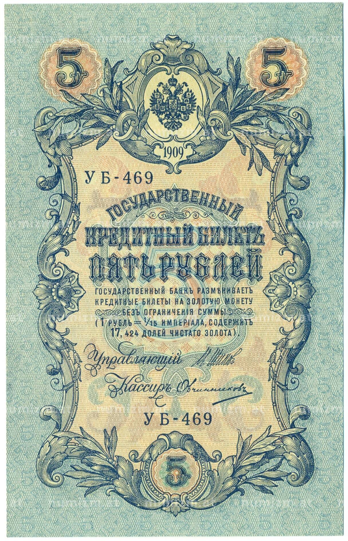 Банкнота 5 рублей 1909 года Шипов / Овчинников (Артикул: T11-44112): подробные характеристики, качественные фотографии в высоком разрешении, низкая цена.